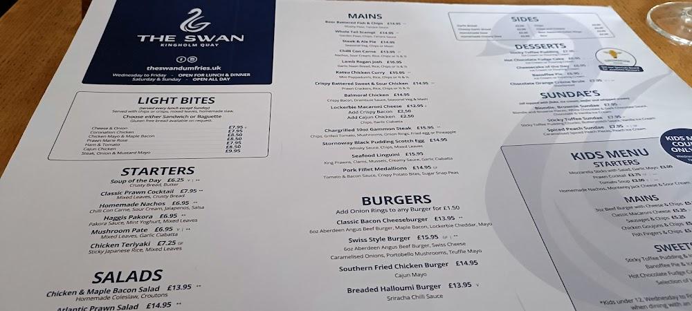 Nestled in the scenic Kingholm Quay, The Swan stands as a vibrant hub in Dumfries. The location boasts easy accessibility and ample parking, making it a convenient stop whether you're a local or just passing through. With its comfortable seating and casual vibe, it invites patrons to relax and enjoy their meals. It's open from Wednesday to Sunday, creating a welcoming atmosphere without the typical weekday rush. The riverside setting enhances your dining experience, providing picturesque views along with the delightful sounds of the water. Popular among families, it also embraces those who prefer solo dining or joining friends for a leisurely drink. The Swan's approach to customer satisfaction shines through its dedicated and friendly staff, ready to ensure every meal is memorable. With a well-curated selection of beverages, and a space that accommodates all, it reflects the community spirit of Dumfries.